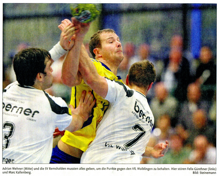 In einer über weite Strecken zerfahrenen Begegnung, die selten mit spielerischen Glanzpunkten aufwarten konnte, siegte die SV Remshalden letztlich glücklich mit 32:29 Toren. Fellbach erwies sich bis kurz vor dem Ende als der erwartet unbequeme Gegner und stellte mit seiner offensiven Abwehr die Remshaldener häufig vor Probleme. Erst in den Schlussminuten sicherten sich die Gastgeber beide Punkte.