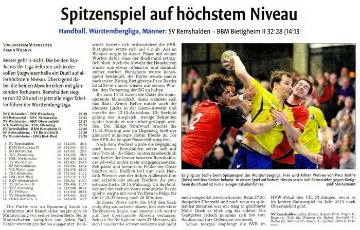Im Spitzenspiel gegen die zweite Mannschaft der SG BBM Bietigheim konnte sich das Team von Trainer Henning Fröschle dank einer "phänomenal guten zweiten Halbzeit" am Ende klar durchsetzen. Somit stehen die remshaldener Ballwerfer nun alleine an der Tabellenspitze. Nach einem schweren Start habe sich laut Fröschle sein Team "immer besser ins Spiel gebracht. Durch eine überragende und in variablen Systemen spielende Abwehr war der Sieg am Ende hoch verdient" Der Sieg hätte sogar noch um einiges höher ausfallen können, zum Schluss der Partie kam leider noch etwas Wurfpech auf Seiten der Remshaldener ins Spiel. Den erkämpften Platz an der Sonne will die SVR sicherlich verteidigen und über die Winterpause genießen.