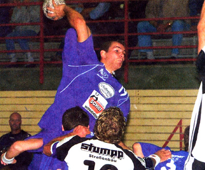 Minuten und grriet schnell mit 1:4 in Rückstand. ,,Die Anfangsformation kam uns spanisch vor“, begründete Torwart Götz Kemner. Die Helmlinger hatten aufgrund ihrer angespannten Personalsituation den zweitligaerfahrenen Spanier Carlos Garcia ausgegraben. Dieser wirbelte auch kräftig und spielte sich mit vier Toren in den ersten neun Minuten schnell in die Herzen der heimischen Fans. Doch auch dem TVB-Keeper tat die südbadische Luft gut. Der ehemalige Zähringer hielt zu Beginn einen Garcia Siebenmeter, einen Gegenstoß vom Helmlinger Siegel und leitete mehrere schnelle Gegenstöße ein. So löste sich der TVB aus der Umklammerung und ging beim 6:5 in