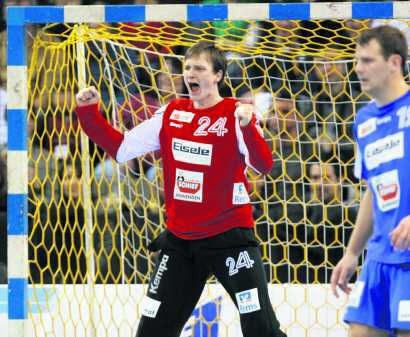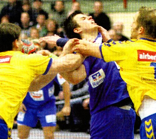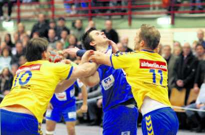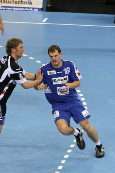 Zum anderen lag’s aber auch an der Art, wie Jürgen Schweikardt seine Spielübersicht bewies, bei den Siebenmetern die Verantwortung übernahm, und wie die Youngster Evgeni Prasolov, Kai Häfner, Alexander Heib ihr individuelles Können zur Geltung brachten. Marco Hauk versuchte in der zweiten Spielhälfte zu viel auf eigene Faust. Patrick Rothe bekam, wie Schweikardt und Simon Baumgarten, die Härte des Gastgebers am eigenen Körper kompromisslos zu spüren.