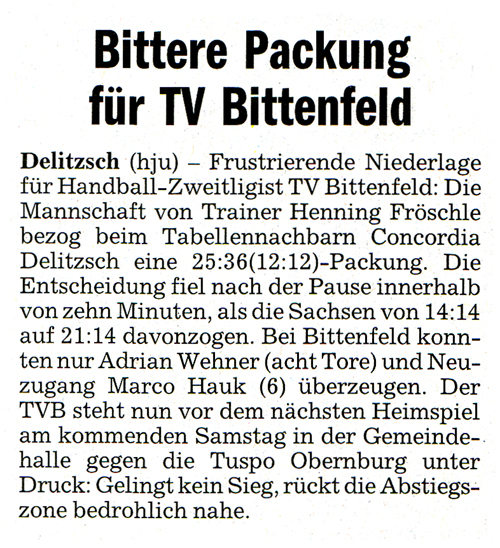 (hju). Eine frustrierende 36:25-Niederlage hat Handball-Zweitligist TV Bittenfeld beim Tabellennachbarn SV Concordia Delitzsch kassiert. Nach dieser Niederlage hat der TVB nur noch fünf Punkte Vorsprung auf einen Abstiegsplatz und muss ab sofort seine Heimspiele in der Gemeindehalle gewinnen, wenn er nicht weiter Richtung Abstiegszone driften will.
