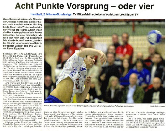 Es war ein klar und deutlich herausgespielter Erfolg beim Aufsteiger und westdeutschen Regionalliga-Meister. Zwar nicht immer souverän, aber jederzeit spielbeherrschend. Der TVB machte da weiter, wo er im Spiel gegen Groß-Bieberau stehen geblieben war. Aus einer beweglichen 6:0-Abwehrformation heraus spielte er schnell nach vorne, und da hatte er mit Marco Hauk wieder den überragenden Sprinter und Werfer in seinen Reihen. Neun Tore gingen wieder allein auf sein Konto, eines schöner als das andere. Seine Form ist derzeit einfach bestechend. Nichts ist mehr von seiner schweren Kieferbruchverletzung in der Vorrunde zu spüren. Mit blitzschnellen Reflexen ausgestattet, ist es eine Augenweide zu sehen, wie sprintschnell er Tempogegenstösse realisiert oder in 1:1-Situationen seinen Gegenspieler austanzt; zudem beherrscht er alle Wurfvarianten aus allen Positionen. Geradezu unverzichtbar für seine Mannschaft ist er auch in der Abwehr, spielintelligent luchst er dem Gegner immer wieder den Ball ab oder zwingt diesen zu Fehlern. Kein Zweifel – Marco Hauk ist der zur Zeit wirkungsvollste und kompletteste Spieler beim TVB.Gustavsson und Krotz, beide im Tor, waren ein sicherer Rückhalt. Hielten aufmerksam, darunter drei Siebenmeter. Die Abstimmung mit Abwehrchef Ludek Drobek und der agressiv und flexibel spielenden 6:0-Deckungsformation stimmte von Anfang an, so dass Leichlingen nach zehn Minuten immer grössere Schwierigkeiten bekam, zum Erfolg zu kommen. Lediglich Eryk Kaluzinski konnte sich immer wieder in Szene setzen und mit insgesamt acht Toren seine individuelle Klasse beweisen. Adrian Wehner, gewohnt dynamisch und kampfstark, wurde in der 36. Minute bei seinem Tor zum 16:23 bös gefoult und musste daraufhin ausscheiden. Andre Niese vom Leichlinger TV bekam dafür zwar die rote Karte, für Wehner ist jedoch die Mitwirkung beim nächsten Spiel, Lokalderby gegen SG Bietigheim, gefährdet. Das Trainer-Dreigestirn Günter Schweikardt, Jens Baumbach, Klaus Hüppchen, konnte angesichts der eigenen spielerischen Überlegenheit und des doch schwachen Auftrittes des Gastgebers vermehrt auswechseln und insbesondere in der zweiten Spielhälfte Spielregisseur Sebastian Seitner und Marco Hauk kreative Auszeiten gönnen. Alle TVB-Spieler waren am Torreigen beteiligt: auch Drobek konnte sich wieder in die Torschützenliste eintragen, ebenso Nachwuchstalent Lenz, Prasolov, Schöbinger und Heib, der seine beiden Siebenmeter sicher verwandelte.