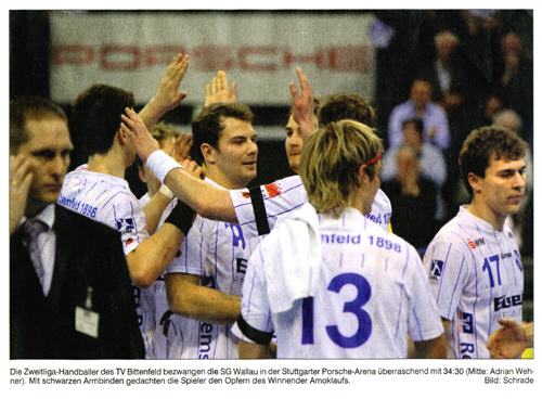 Doch Bittenfeld zeigte Moral. Fehler des Gegners wurden nun konsequenter ausgenutzt, die Gastgeber setzten sich bis zur 52. Minute auf 23:17 ab. Dann gewann das Nervenflattern wieder die Überhand. Abwehrchef Ludek Drobek kassierte nach seiner dritten Zweiminuten-Strafe Rot, die TSG kam noch einmal heran. Doch zu spät, Bittenfeld siegte verdient mit 25:23.