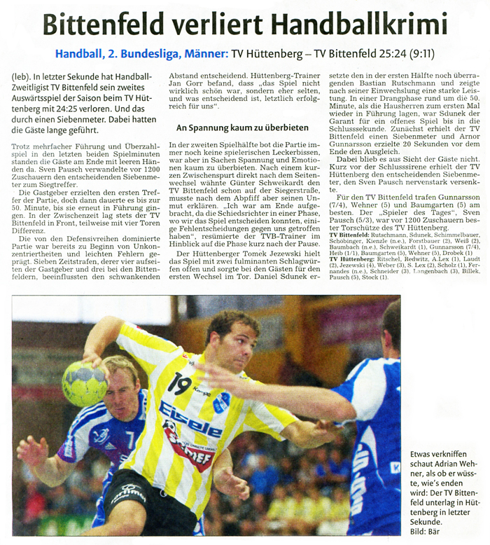 TV Bittenfeld verliert Handball-Krimi in Hüttenberg! In letzter Sekunde verlor der TV Bittenfeld sein zweites Auswärtsspiel der Saison in Hüttenberg. Per Siebenmeter entschied der Hüttenberger Sven Pausch die hart umkämpfte Partie und besiegelte den 25:24 (9:11) Endstand. Trotz mehrfacher Führung und Überzahlspiel in den letzten beiden Spielminuten, standen die Wild Boys am Ende mit leeren Händen da. Für den TV Bittenfeld trafen Gunnarsson (7/4), Wehner (5) und Baumgarten (5) am besten. Der „Spieler des Tages“, Sven Pausch (5/3), war vor 1200 Zuschauern bester Torschütze des TV Hüttenberg.