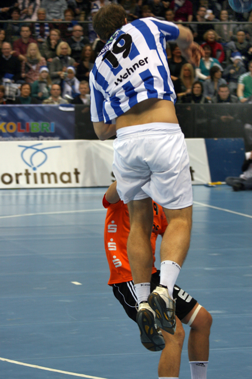 Der Verlauf der ersten Halbzeit erschien wie eine Fortsetzung des letzten Aufeinandertreffens im März dieses Jahres. Damals endete das Duell um die Spitzenplätze der 2.Handball-Bundesliga mit einem hart umkämpften 22:22 unentschieden. Völlig offen war die Partie auch heute nach den ersten 30 Minuten.
