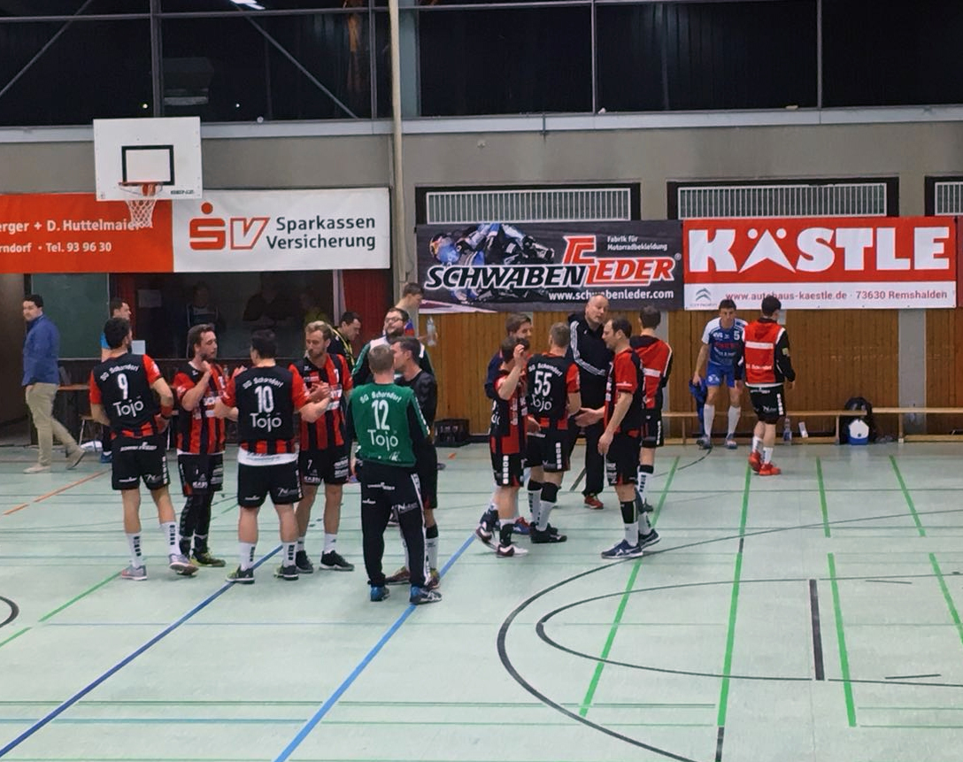 Die Vorgabe der Trainer Kästle/Wesp waren klar. Technische Fehler minimieren und eine bessere Chancenauswertung sollte der Schlüssel zum Erfolg sein. Waiblingen wollte sich aber nicht abschütteln lassen und kamen immer wieder über gute Kreisanspiele zu einfachen Toren von 6 Metern. Das Spiel blieb über lange Zeit Eng. Zwar konnte Schorndorf immer wieder 2 oder 3 Tore vorlegen doch weiter absetzen konnte man sich nicht. Beim Spielstand von 24:26 nach 47 Minuten nahm Schorndorf seine zweite Auszeit und diese sollte Wirkung zeigen. Ein weiterer gehaltener 7-Meter vom zwischenzeitlich eingewechselten Heiko Busse und 2 Tore in Folge brachte einen 4 Tore Vorsprung und zwang Waiblingen zur Auszeit. Die Waiblinger versuchten nun mit einer offensiveren Abwehrvariante zum Erfolg zu kommen doch die Schorndorfer bewegten sich gut fanden immer wieder Lücken. Nach 60 Minuten hatte man es, durch eine geschlossene Mannschaftsleistung geschafft und das erste von 7 Endspielen für sich entscheiden können. Alle eingesetzten Spieler konnten sich in die Torschützenliste eintragen und genau auf dieser Leistung muss man für die kommenden Aufgaben aufbauen.