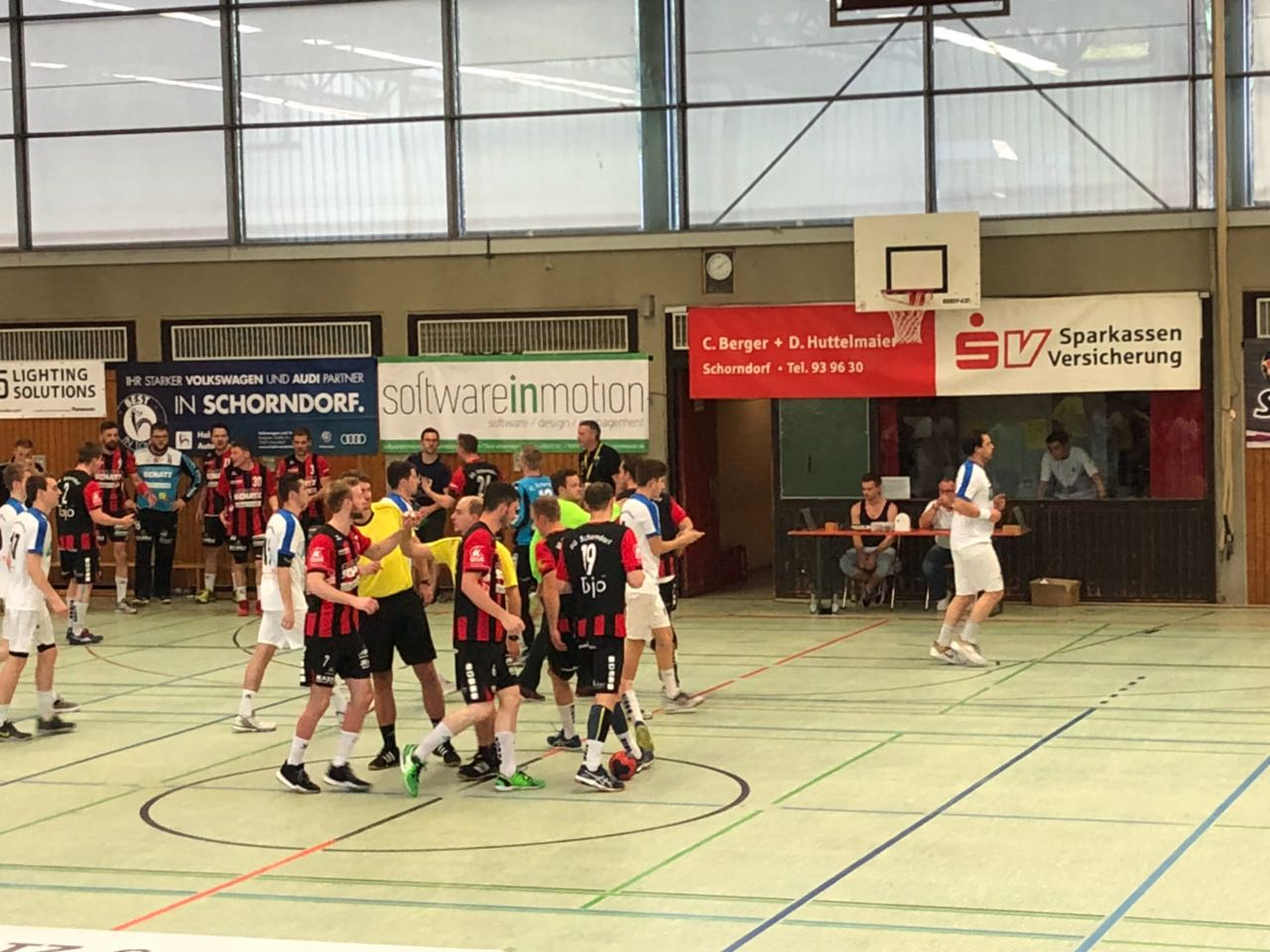 Technische Fehler, Kopfloses agieren und das auslassen klarster Torchancen prägte das Spiel in der Anfangsphase der Schorndorfer, während die Oeffinger mit viel Tempo und top motiviert den Daimlerstädter den Schneid abkauften. Nach 9 Minuten hatte der scheidende Trainer Slavko Pustoslemsek genug gesehen und legte beim 5:1 die erste Auszeit. Leider sollte diese keine positive Wirkung haben und so konnten sich die Gastgeber mit wenig Mühe über ein 7:2 auf 13:5 absetzen. In der 19 Minute dann noch ein Schreckmoment als Benjamin Westhauser nach einem Ball hechtete aber Stefan Niederer schneller war und der Hechtsprung in den Beinen von Schorndorfs Kapitän endete. Für beide Spieler war das Spiel vorbei. Westhause sah die rote Karte und Niederer konnte nicht mehr eingesetzt werden. Mit einem deutlichen Rückstand von 17:7 wechselte man die Seiten.