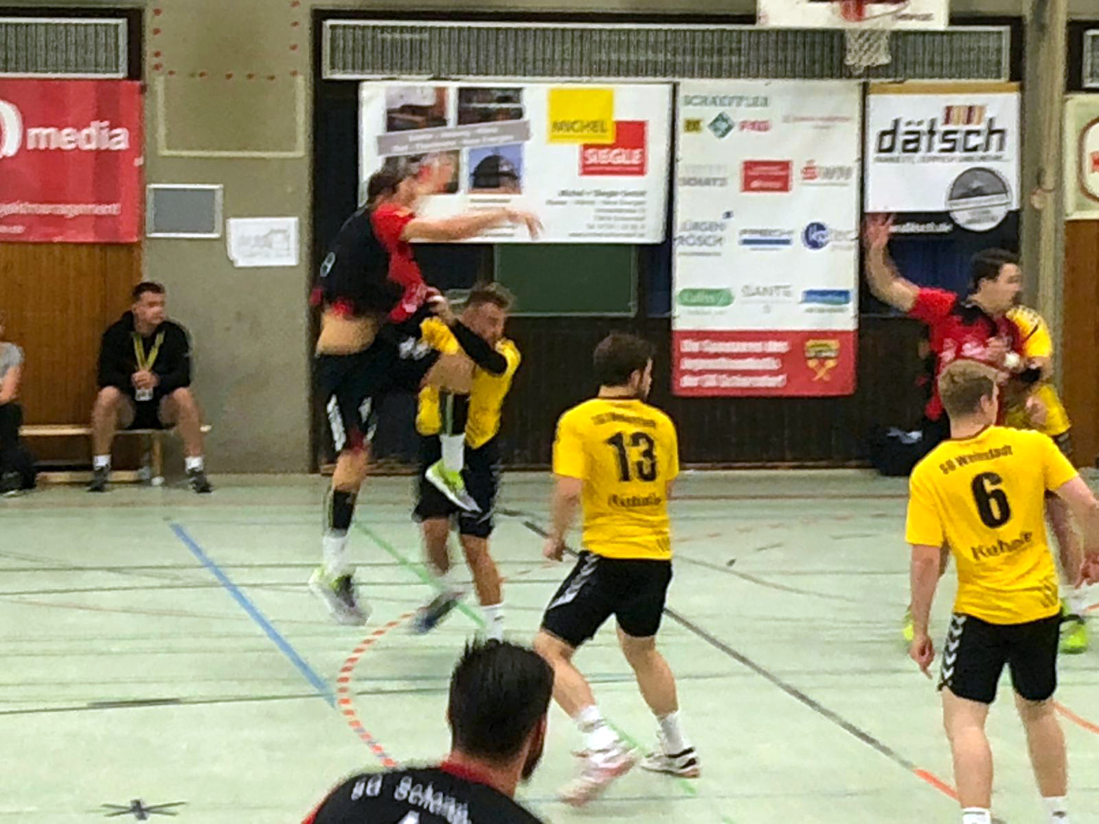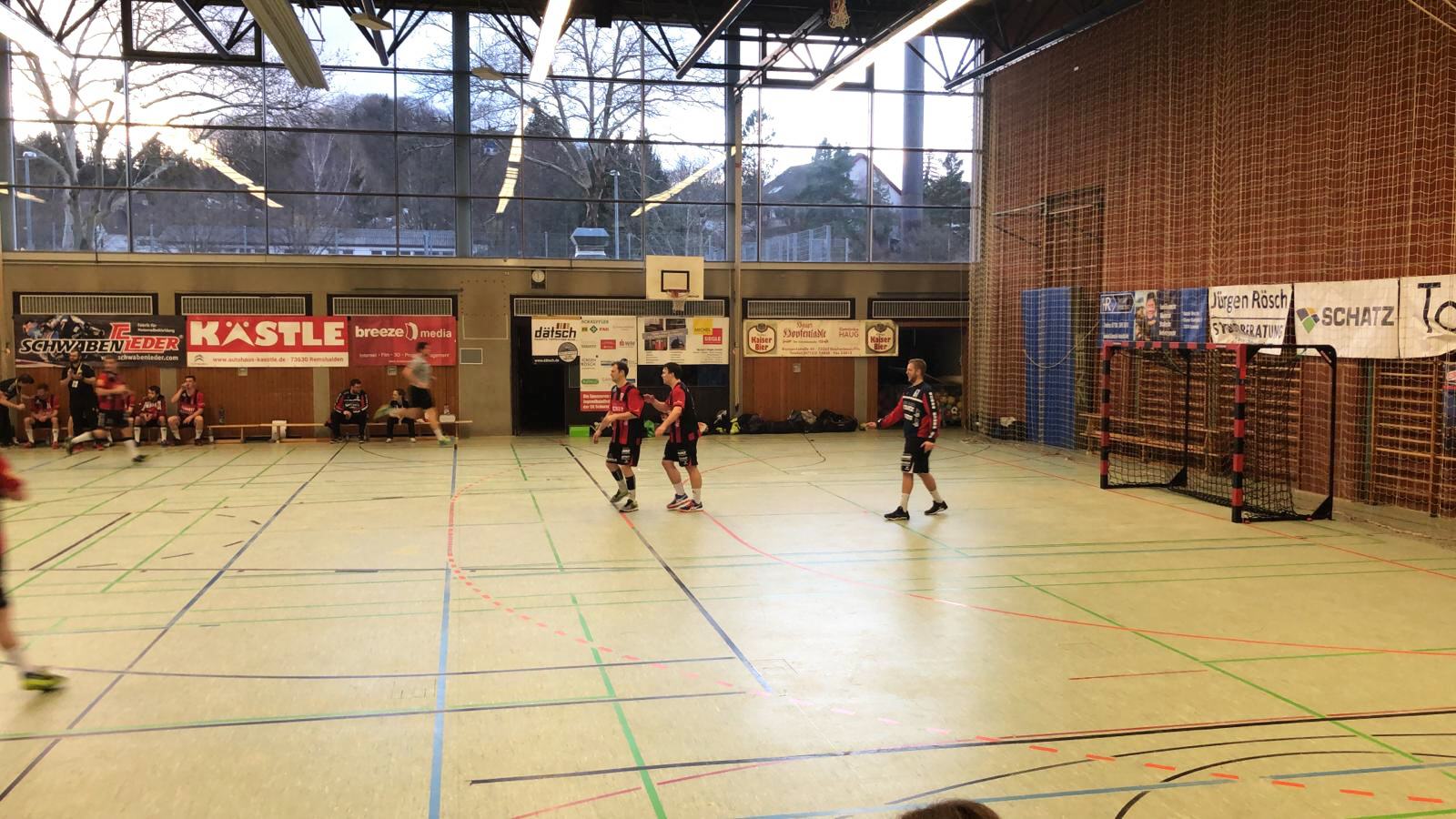 Zu Beginn der Partie sahen die Zuschauer ein Spiel mit hohem Tempo. Felix Kästle konnte für die rot schwarzen den ersten Treffer zur 1:0 Führung erzielen. Diesen glich Weinstadt allerdings postwendend aus. Weinstadt kam nun immer besser ins Spiel und stellten die Schorndorfer vor allem im Angriff vor Schwierigkeiten. Zu wenig Tiefe war der Grund weshalb man des Öfteren in Zeitspielnot kam und dadurch schlechte Wurfpositionen nehmen musste. Der sichere 7-Meter Schütze Sascha Wilhelm erzielte nach 17 Minuten bereits seinen dritten 7-Meter zum 5:9 Zwischenstand. Doch auch bei den Weinstädtern lief nicht alles rund und so fanden die Schorndorfer bereits drei Minuten später beim 8:10 den Anschluss. Dann folgte leider die stärkste Phase der Weinstädter. Hinten wurde konsequent verteidigt und auch der Torhüter konnte einige Bälle parieren. Tore per Gegenstoß waren die Folge und Trainer Nico Kästle legte beim 8:13 die Grüne Karte. Doch die Wirkung der Auszeit verpuffte und Weinstadt ließ sich nicht beirren. Bis zur Halbzeit konnten Sie Ihren Vorsprung auf 10:18 vergrößern und somit schon fast für eine Vorentscheidung sorgen.