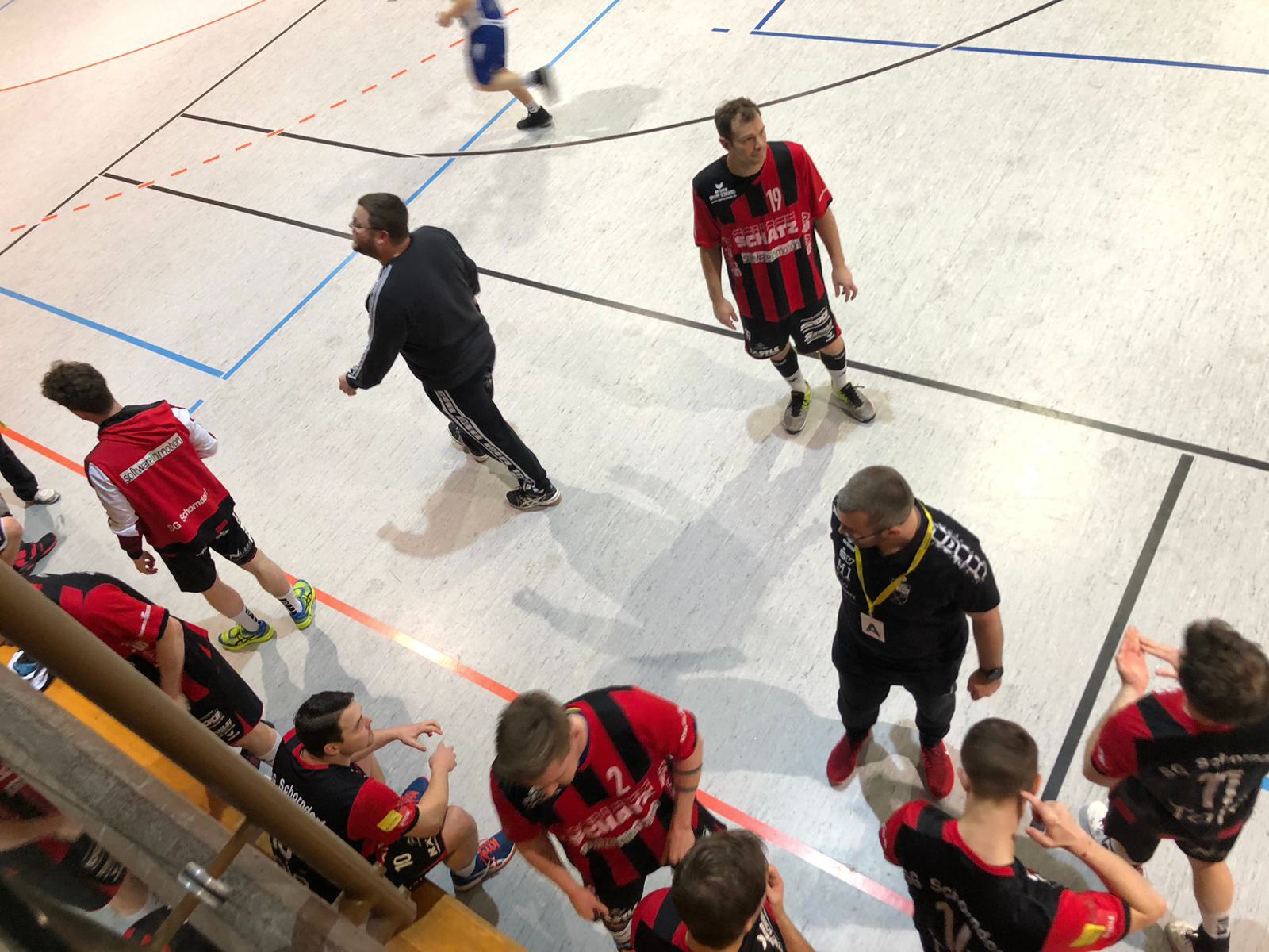 Nach nervösem Start in die Partie waren es die Gäste, die besser ins Spiel fanden. Nach 11 Minuten konnten Sie sich einen drei Tore Vorsprung erspielen und Trainer Michael Rill meldete das erste Mal Gesprächsbedarf an. Die Schorndorfer schienen mit dem Kopf nicht 100% bei der Sache zu sein was sich in einigen technischen Fehlern und verlorene Zweikämpfe widerspiegelte. Nach der Auszeit konnte Simon Mack in der 20 Minute den Anschluss zum 9:10 herstellen. Allerdings verpasste man es in der Phase den Ausgleich zu erzielen und so konnte Oeffingen mit einer 12:14 Führung in die Halbzeit gehen.