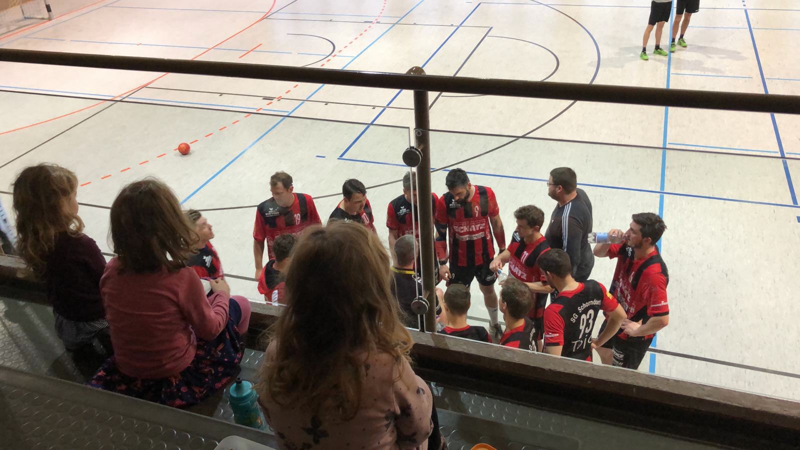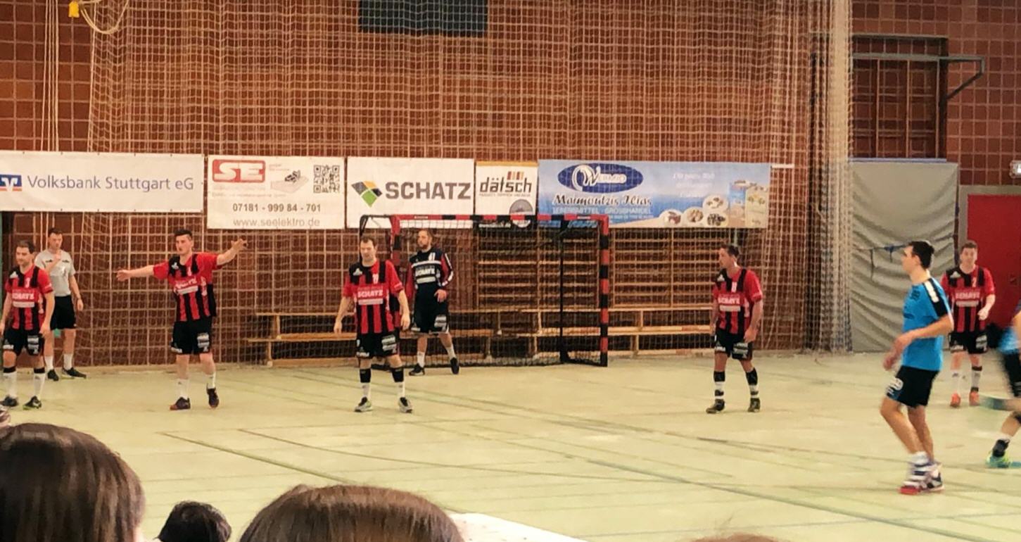 Wie schon in der Woche zuvor startete das Spiel nervös. Zwar arbeitete man gut in der Abwehr, doch konnte daraus keinen Nutzen ziehen und einige Chancen wurden vergeben. Bis zur 10 Minute entwickelte sich ein ausgeglichenes Spiel bevor man sich beim 4:7 einen kleinen Vorsprung erspielen konnte und so Christian Schüle zu einer Auszeit zwang. Durch 2 schöne Einzelaktionen von Markus Karoly auf der rechten Außenbahn und ein gehaltener 7-Meter von Marc Krammer vergrößerte man den Vorsprung auf 5:9. Durch Zeitstrafen waren die Schorndorfer kurzzeitig nur noch mit 3 Feldspielern auf dem Feld. Doch durch gute Beinarbeit und geduldigem Spiel im Angriff konnte man den Vorsprung behaupten. 2 Gegenstöße von Stefan Niederer brachte die Gastmannschaft mit 9:13 in Front. Leider konnte man die Konzentration in dem letzten 5 Minuten nicht mehr hochhalten und so kassierte man mit der Pausensirene den 14:15 Anschlusstreffer.